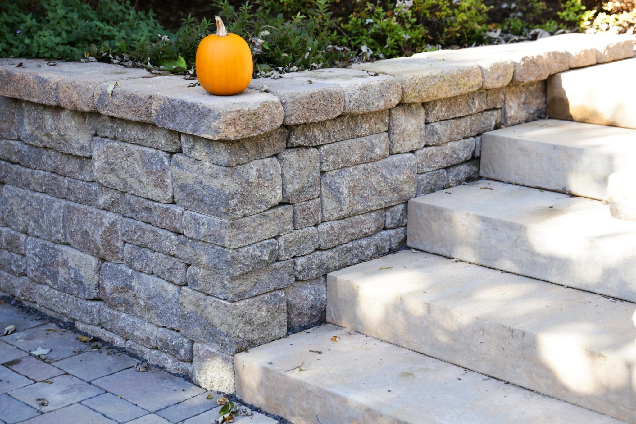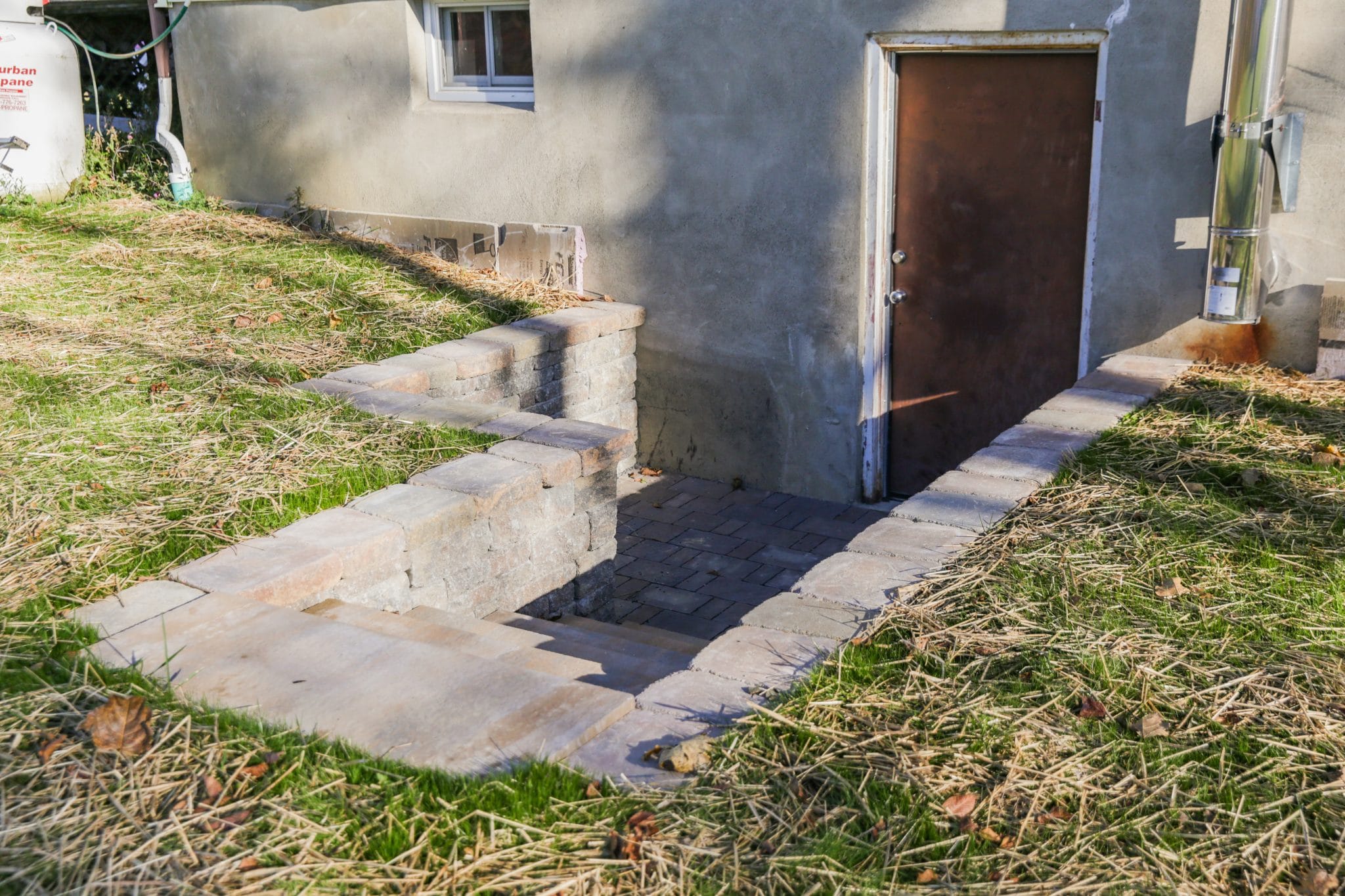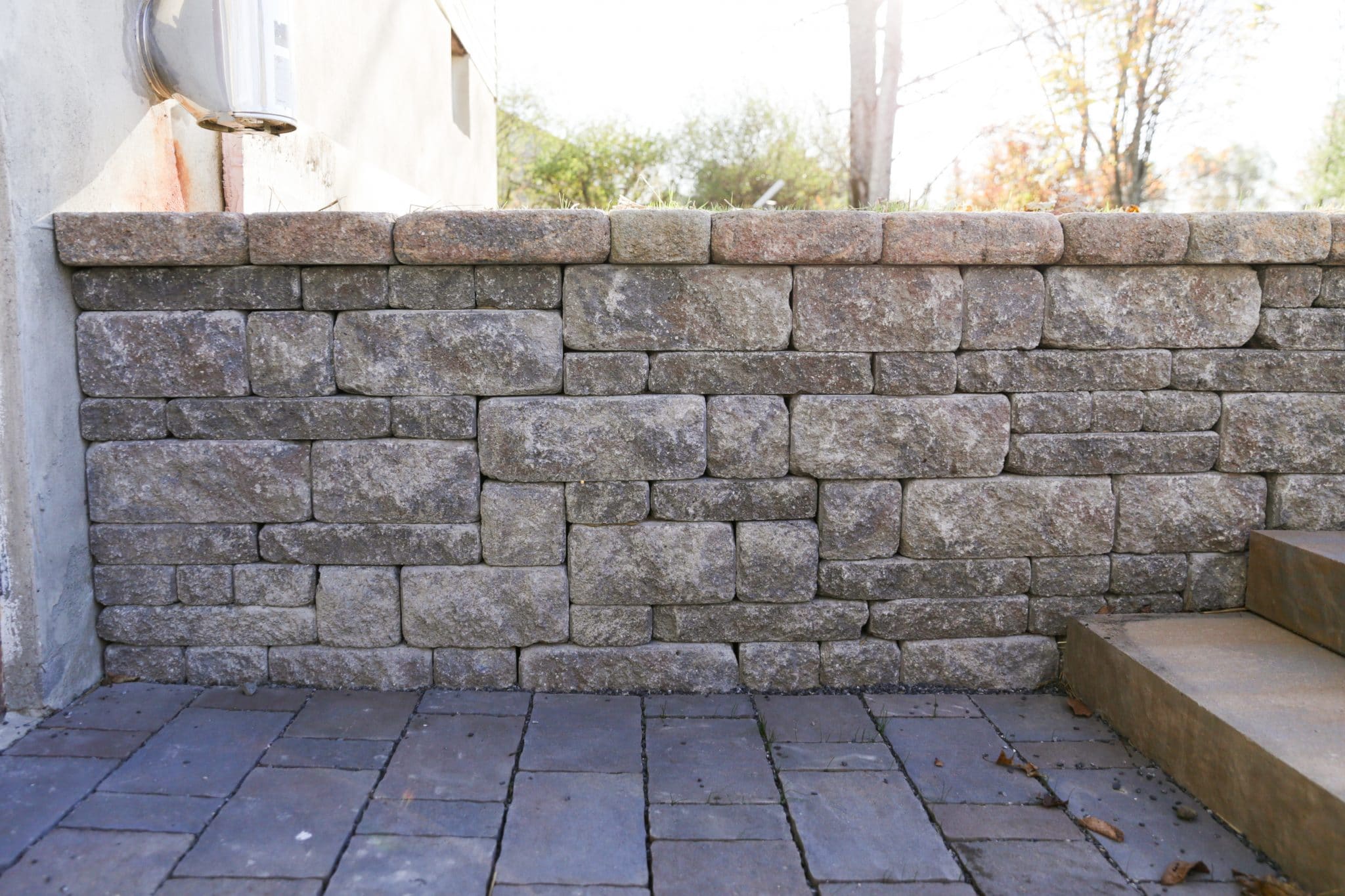 We removed a failing cinderblock entry when we installed the landscape drainage for this home in Gardiner. A year later, we installed this new basement entry featuring steps and pavers too! The Brookshire was the perfect fit in terms of scale and style. We even used it for a wing wall off to the side, showing off how you can use this product for curves too!