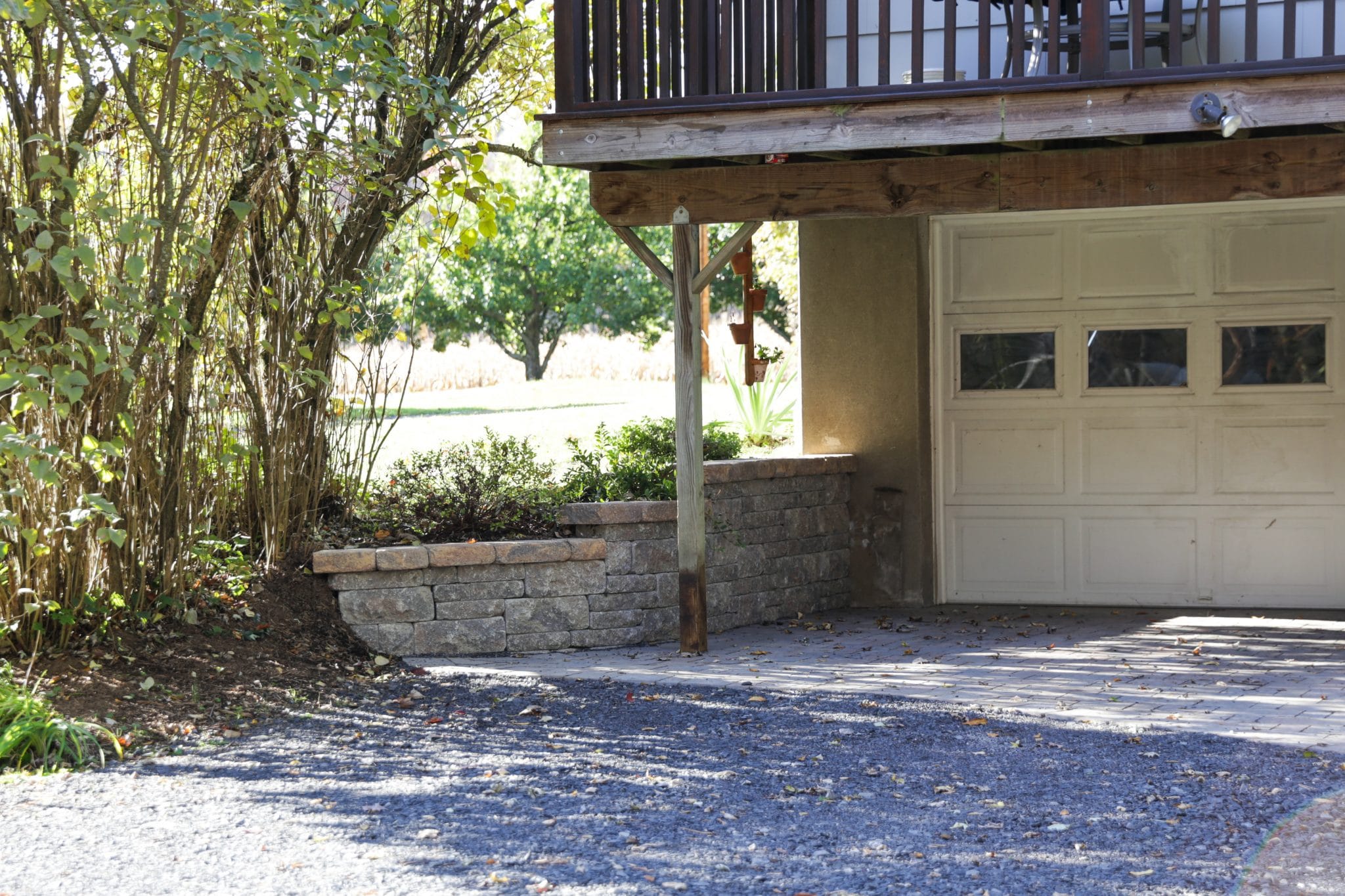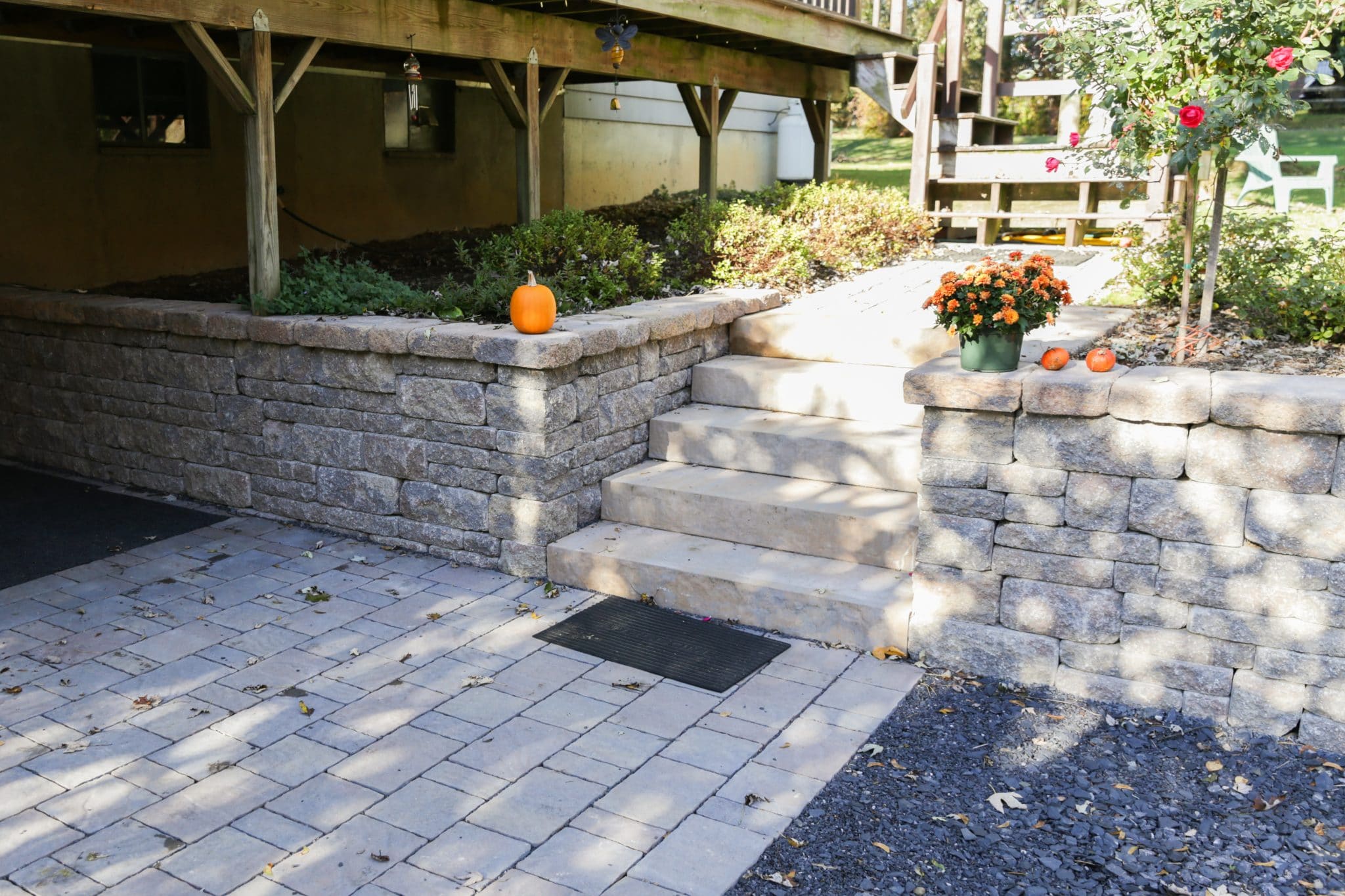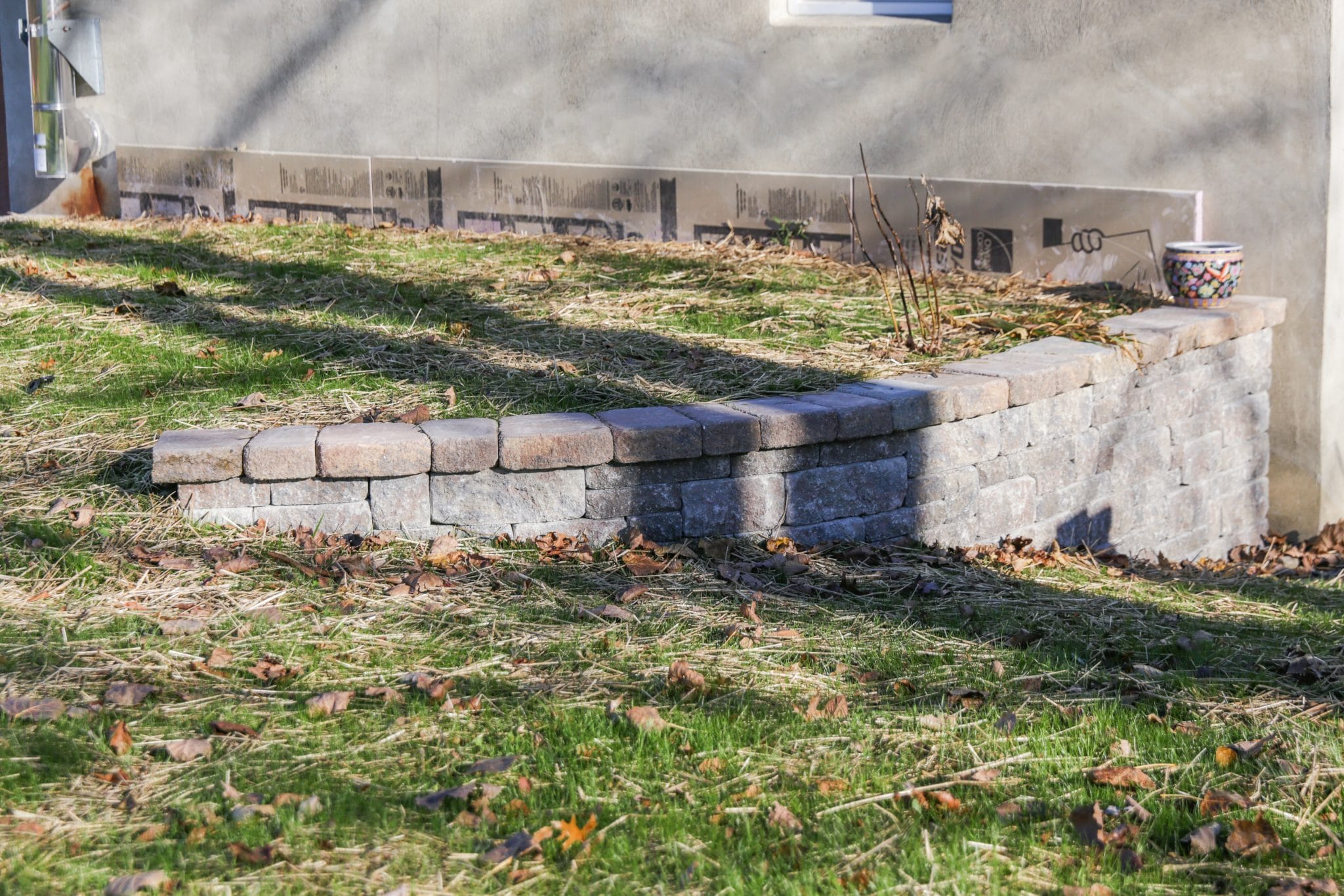 We removed a failing cinderblock entry when we installed the landscape drainage for this home in Gardiner. A year later, we installed this new basement entry featuring steps and pavers too! The Brookshire was the perfect fit in terms of scale and style. We even used it for a wing wall off to the side, showing off how you can use this product for curves too!
